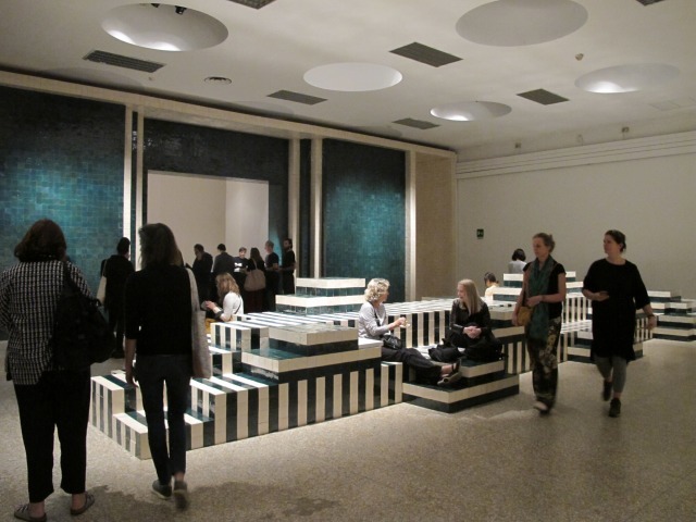 巨大なハンドメイド感のあるタイルで出来た箱が展示会場のいたるところに!