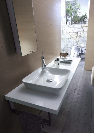 洗面器の中に浮かぶ小島のように配置された水栓が特長です。