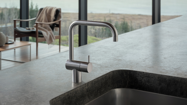 VOLAの水栓は施主が以前の自宅でも使用しており、今回はキッチン、洗面所、トイレの全てで採用。フリッツ・ハンセン、特にアルネ・ヤコブセンの家具を中心に設えた空間の中で、彫刻性と機能性を極めたヤコブセンのデザインにおける集大成のひとつであるVOLAのアイテムはこのプロジェクトの重要なポイントとなっている。
