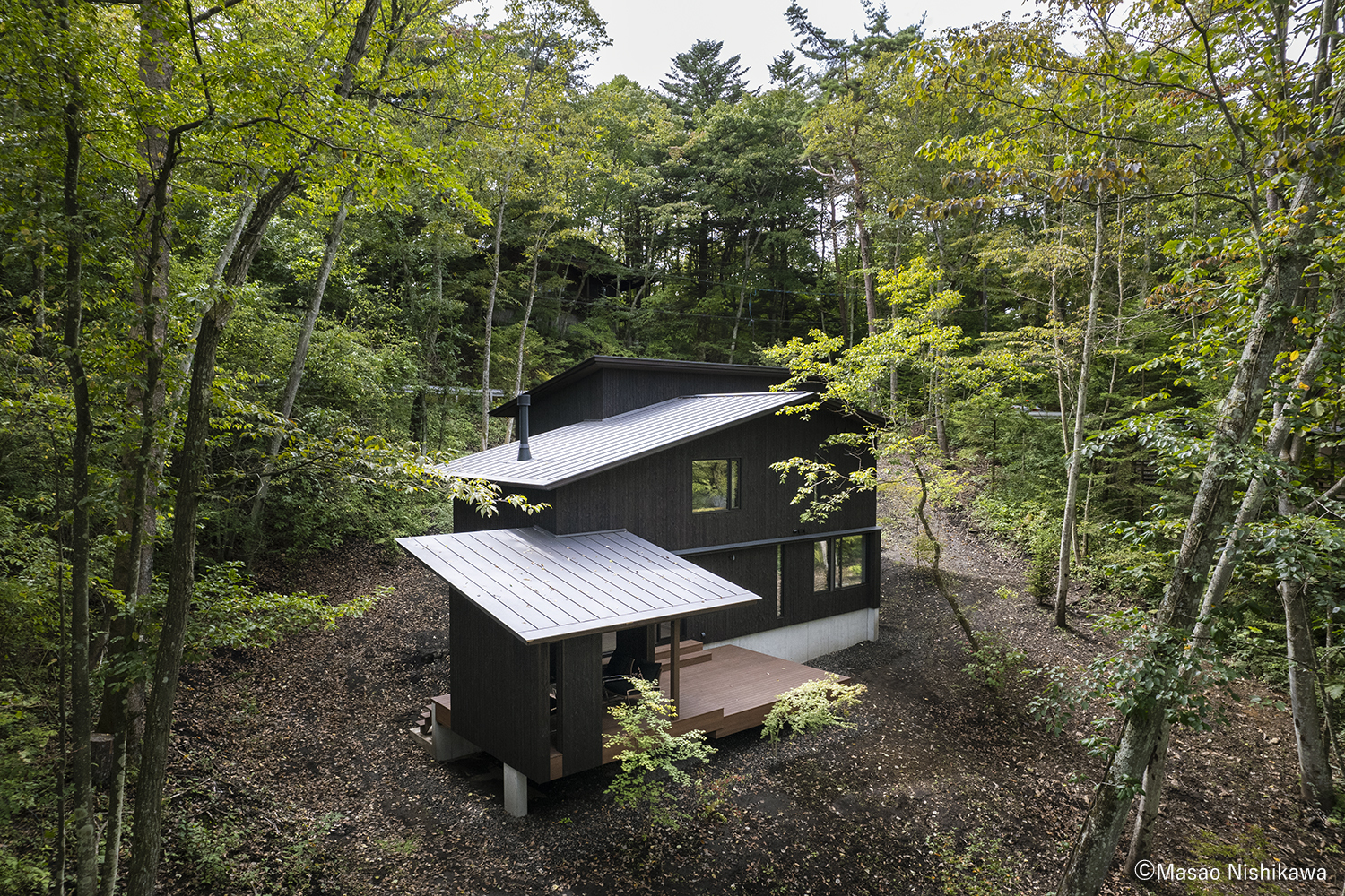 敷地は最大11mの高低差があり、北に下がる傾斜地。昔ながらの軽井沢の植生が魅力の立地である。クライアントのご要望は四季を通して利用でき、親族、友人も呼べる山荘。夏はもちろん、冬も快適に過ごせる暖炉のある暖かな空間が求められた。窓はすべてトリプルガラス、高い気密性と断熱性を併せ持っている。