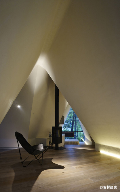 垂直の壁面がほとんどない、テントのような断面形状は、樹木の枝葉のために上空を残しながら、人のための最大限の床を地表近くに生み出すことを目的としている。また同時に、現代の別荘に真に必要とされているものは「物品を置くための壁」ではなく、周囲の自然環境を享受できる、広々とした「空間」そのものだ、という考えにも基づいている。