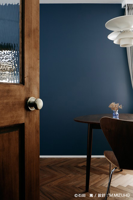 落ち着いた空間と、陰影のメリハリをつけるために採用した濃紺の壁紙。 祖父から受け継いだアンティークなサイドボードの色味に合わせ、アート作品や写真を展示するスペースを設けた。