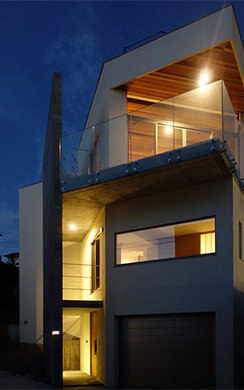 鎌倉市、七里ヶ浜の丘の上で海から少し入った場所に建つ、サーファーでもあるクライアントの家の建て替え。白い外断熱の建物と西日や視線を遮るために設けた大きな杉板型枠打放しの壁に、ガラスの手摺が印象的な外観の住宅には、街と調和しつつ暮らしに海を取り込むため、街区に合わせた外観の軸と、海を眺めるために斜め45度に振ったインテリアの軸の2つの軸線を持たせた。以前に建てられていた家の窓からは、主に向かいの家や隣の家が見えていたのに対し、今回の計画では家の奥からでも海の景色を楽しむことができるようになった。また、屋上に上がると、三浦半島から伊豆諸島、伊豆半島、富士山、丹沢など、素晴らしい景色を眺めることができる。景色だけでなく、身近に水を感じてもらえるよう、フローリングや窓台、カウンター材などに、さざなみの模様が彫られた板材を使用し、洗面、バスルームにも上質な設備を採用した。