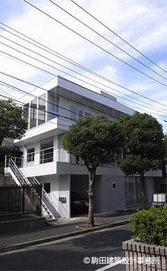 敷地は南側を除き、隣地の建物が迫っている。南側も道路に面した間口4mを除くと、隣地建物のアプローチとなっているので、外部に対してある程度閉鎖的に計画した。開口部にはガラスブロックを積極的に用い、自然光を内部に採り入れ、閉塞感をなくしている。
