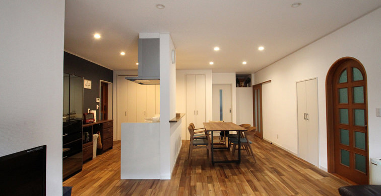 『真新しい雰囲気より古い感じの方が好き』というご夫妻。腕のいい大工であるお父様が建てられた丈夫な家であり、ご主人が生まれ育った思い出深い場所でもあることから、柱や建築当時を思い出させてくれるレトロな扉など、残すところは残しつつ、今の暮らし、ライフスタイルへと変化させた。