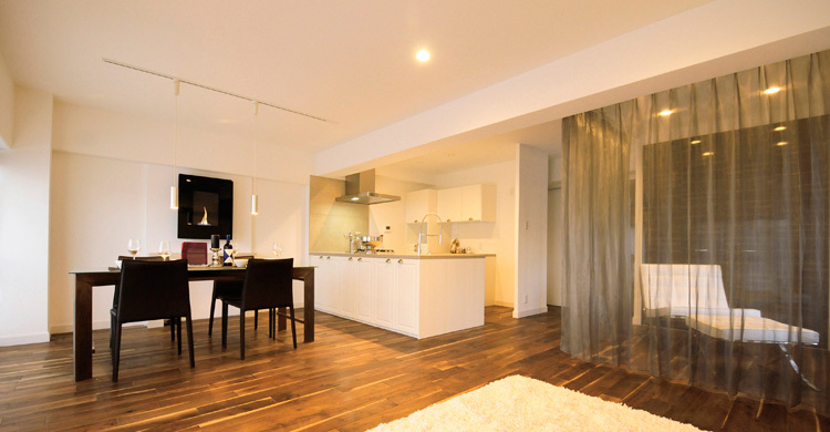 ゆったりとしたレイアウトの対面式キッチンを中心に、ダイニング、リビング、更にカウンターで緩く仕切られた和室を配した。完璧で高品質な躯体を目指すために配線、配管類を一本も通さないというルールを追求し開発された「設備コンソール」の間接照明が、落ち着いた光をリビングダイニングに投げかける。