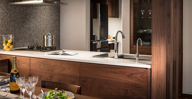 床材・サッシ・ドア・キッチン・造作家具にいたるまで、全てブラックウォルナットに統一。木の杢目が綺麗に見える魅せ方を追求し、樹種が持つ上品で落ち着いた印象を更に際立たせている。