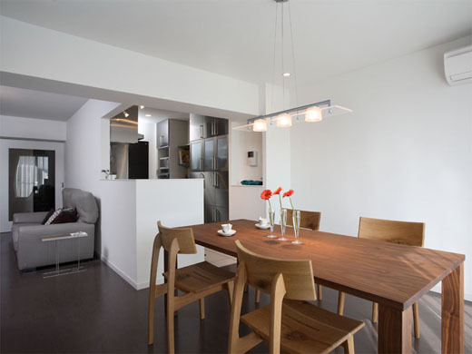 お施主様が亡き祖母から譲り受けた築30年を越すマンション。 結婚後一年ほど生活してみた上で要望をまとめ、全面改装に至る。