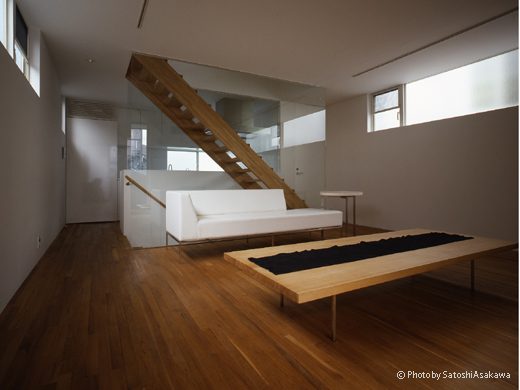 夫婦と幼い二人の娘による4人家族の住宅で、各階の機能をユーティリティ、リビング、寝室と、明確にした。リビングは、キッチンとの境を大きなガラスと階段とで間仕切りすることで視線を広げ、また階段の上方からキッチンを見渡せるといった楽しさも演出した。