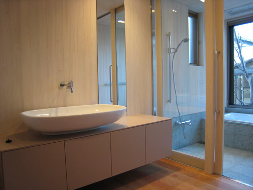 自宅兼事務所。間口が狭く、3方は建物に囲まれている細長い敷地だが、東には66haの広い緑地を望む美しい場所であった。当時残っていた旧宅の2Fから見た緑いっぱいの風景が忘れられず、この土地に家を建てる計画を始めた。敷地には何度も足を運び、同時に東に広がる森への探検も幾度となく行ううち、この森に続くようなアプローチを持つプランにしたいと考えるようになった。周辺環境に配慮した控えめな佇まいと、朽ちても美しい外套をまとった建物を作りたいという思いは、常に心に留めているテーマである。そこには日本人が太古より、いびつさ、不揃いであること、そして何より寂びに美を感じていたことを思い出させたいという願いがある。パートナーが作る地元の土を使ったタイル、コンクリート、国産スギのサッシ、木毛セメント板が、この外観の要素となった。長くインテリアデザインの仕事に従事しており、素材の質感や厚み、色、重さといった視覚や触覚から得られる要素には常にこだわりを持ってきた。水栓金物やシンクといった器具に至っては、その機能美や技術の高さも見ることになる。薄いリムのSCARABEO社のTR2シリーズの洗面ボウル、水栓金物は細部まで妥協のないデザインのKWC社のAVAシリーズ、キッチンにも同社の水栓金具を採用。2Fのトイレは、円形で大きさもちょうど良いものと思い選んだ手洗器が偶然にもSCARABEO社であった。ここでの生活を始めて2度目の夏を迎えた。敢えてコンクリートを打たず、転圧とした駐車場のタイルの間に苔が生え始めた。いつかこの敷地内の植生が森と繋がり、この景色の一部になっていけば良いと願っている。