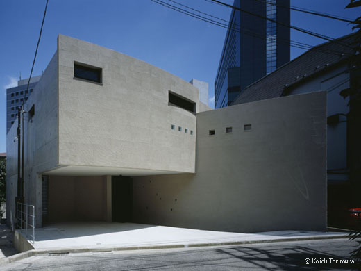 住宅密集地の複雑な敷地形状にあわせて建物の外形を決め、高度斜線をクリアーする高さに抑えて計画。そこから鋭角の部分に3つの坪庭を配した。