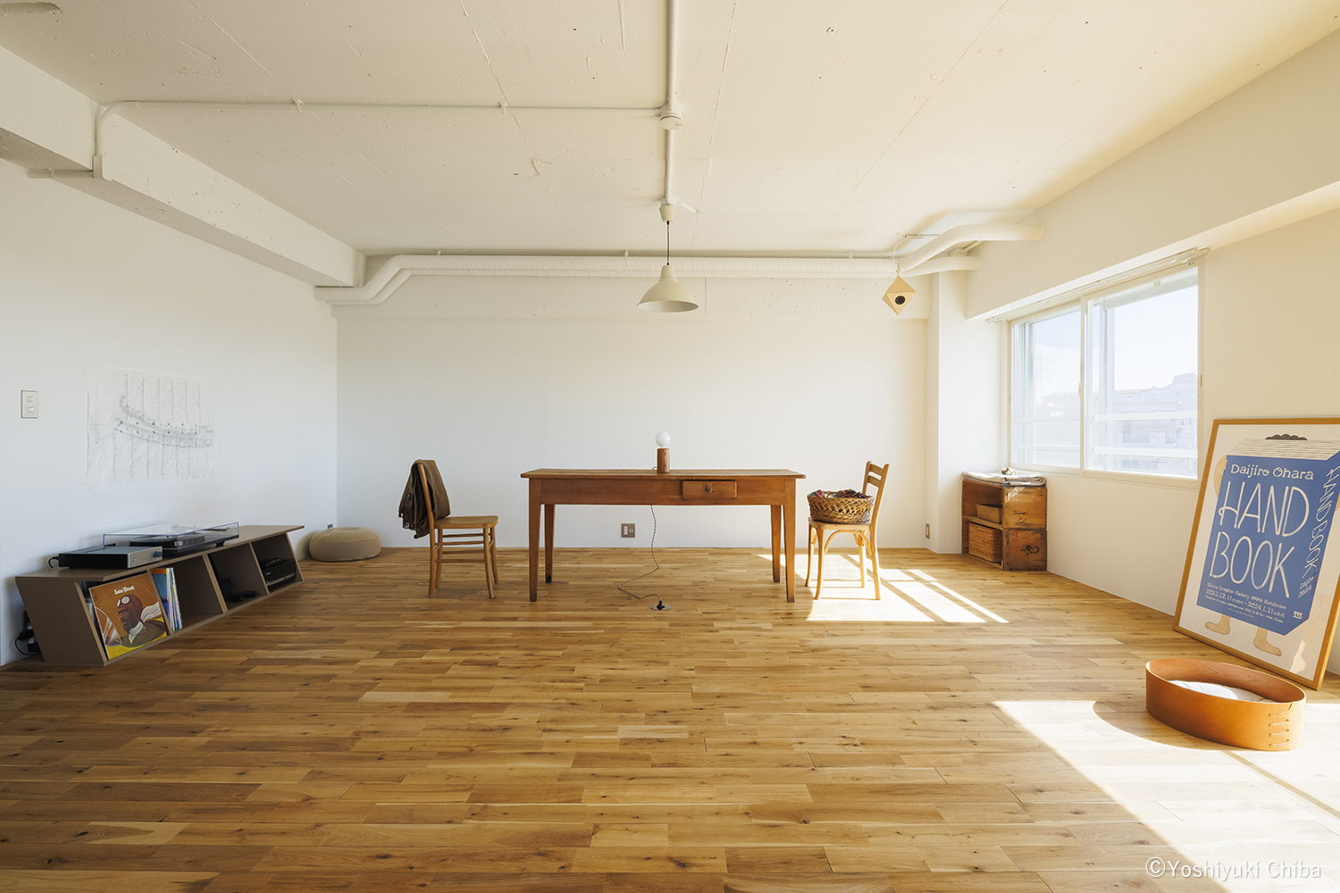リノベーションのテーマは「空気が循環するオープンな空間」。元々3LDKだったが、壁を撤去してスケルトンにし、ひとつながりのワンルームへ再構築した。仕切りをなくすことで視線の抜けが生まれ、どこにいても窓の外の景色を楽しめる開放的な空間としている。