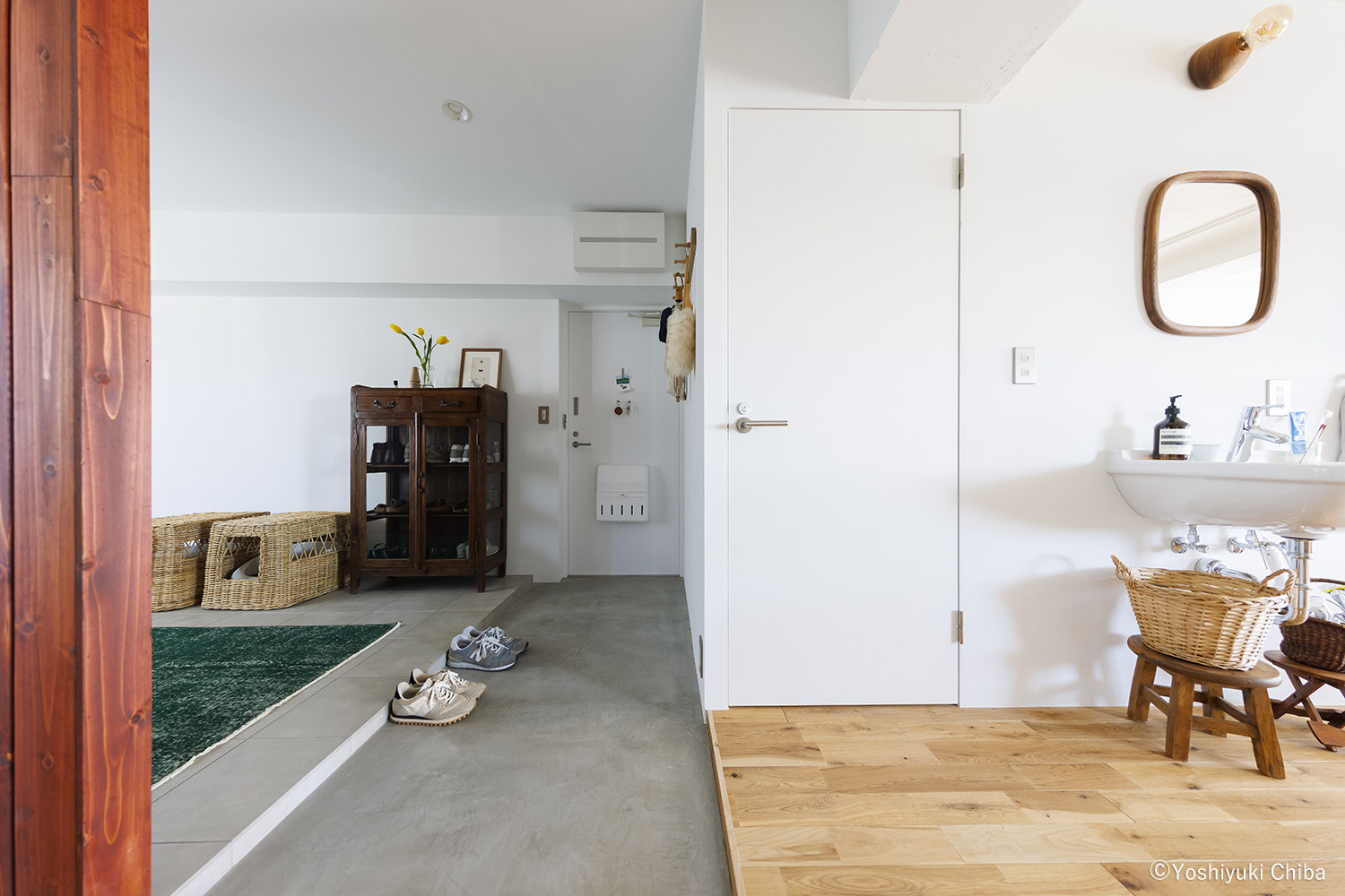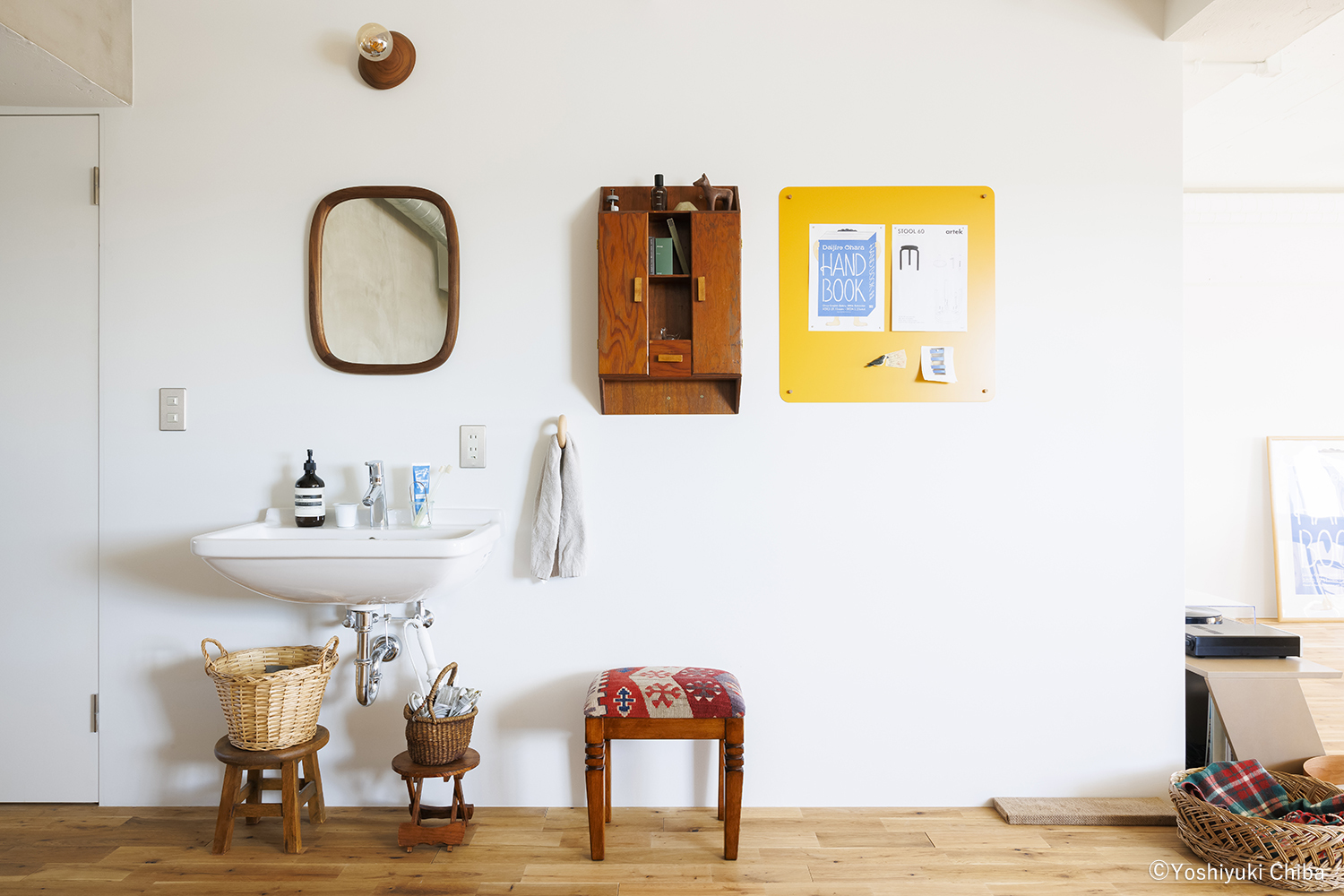 もう一つの特徴は、あえて作り込みすぎない計画。キッチンやリビングには造作収納を設けず、収納はウォークインクローゼットのみとした。前の住まいで使っていた家具などを活用し、キッチンにはご夫婦自らDIYでカウンターを設置するなど、暮らしながら整えていく余白を残した。オープンな洗面スペースにはホシノタニ団地でも使用していたStarck 3の洗面ボウルを採用。時代を超えて愛されるデザインがアンティーク家具とも自然と馴染んでいる。