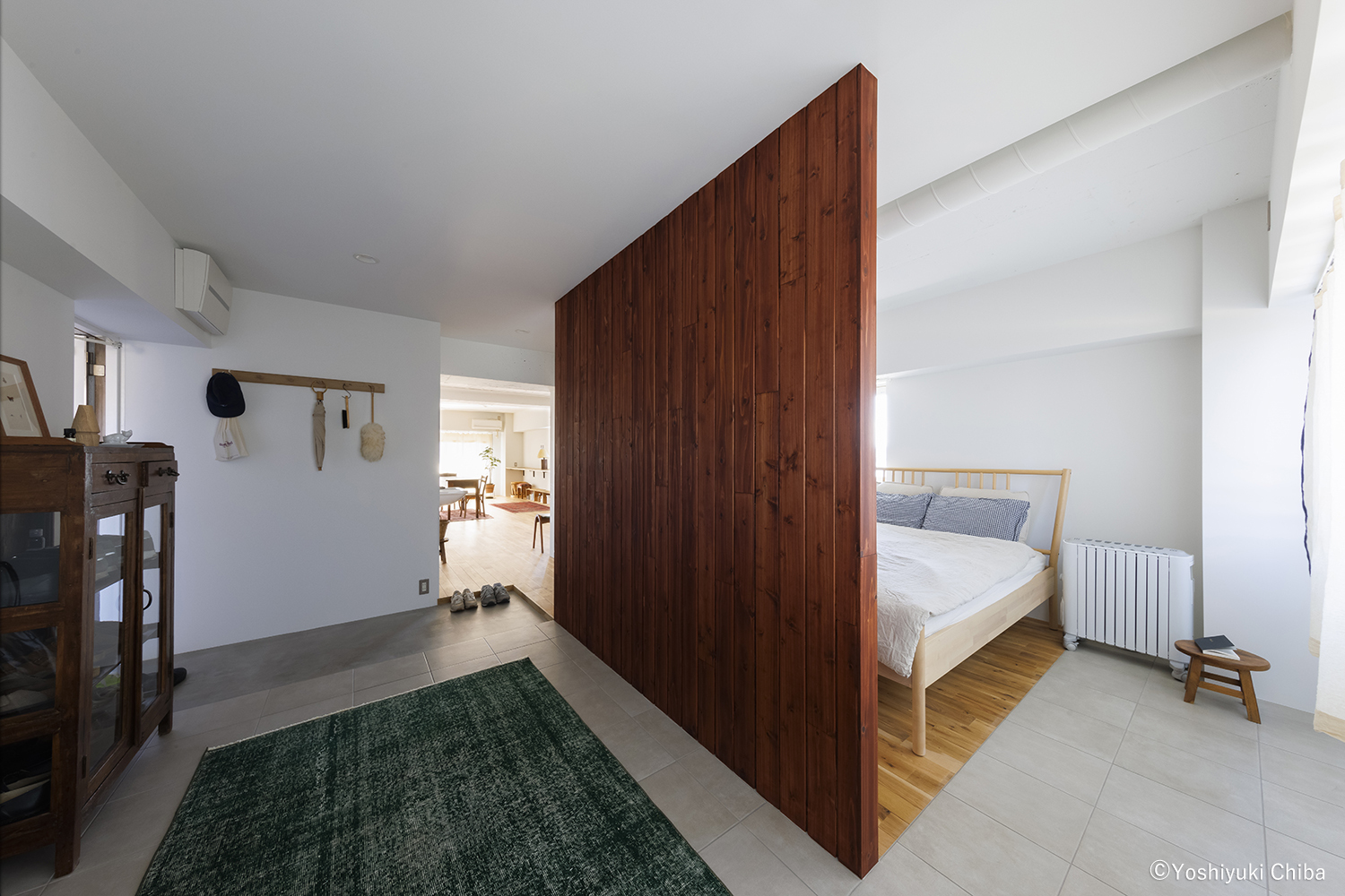 明るくのびやかな南側LDKに対し、寝室、浴室、洗面所、玄関まわりは、北側のインナーガーデンを活かした仄暗く静謐な空間とし、ワンフロアの中にも対照的な世界観を生み出した。