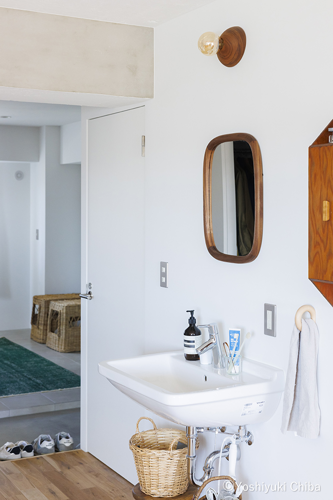 リビングの横にある洗面空間には、シンプルでありながらほどよい存在感の洗面ボウルを採用。