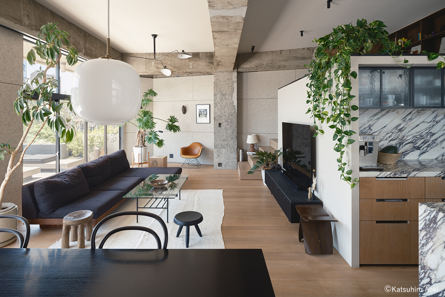 L字型の平面の中に個室を設けず、ワンルームとしてデザインされ、石、木、真鍮、コンクリートといった素材を各所にバランスよく配置した。