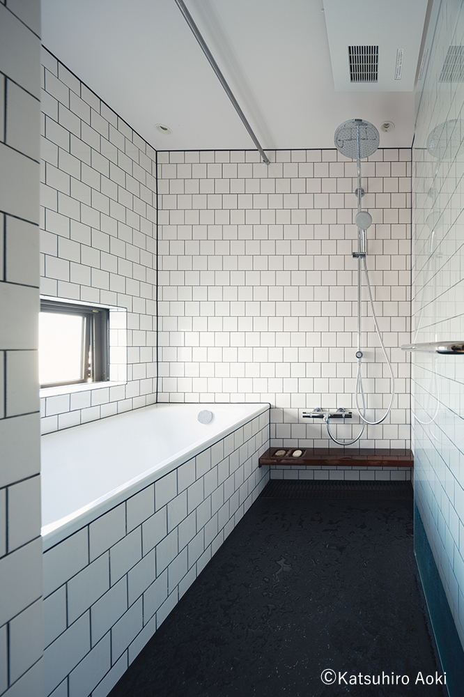 2階はラウンジと客室を改修した。3室ある客室は露地を持つ和室へと生まれ変わった。3、4階の客室は既存を残しつつ水まわりを改修。それぞれ違う色の施釉タイルを使い静寂に包み込まれるような浴室となった。