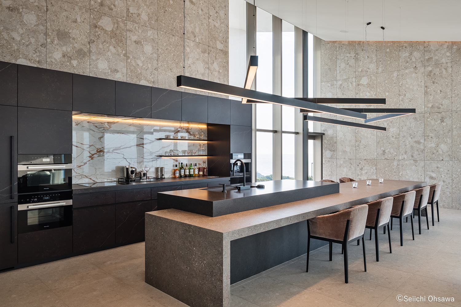 「スイート 海」からは大鳥居を眺めることができ、水平に連続する窓からは沈んでゆく夕陽を望む。この黄昏の光は黄金色に輝き、室内は一瞬にして光影に包み込まれ静寂な海と向き合う。そして非日常の世界へと引き込まれる。