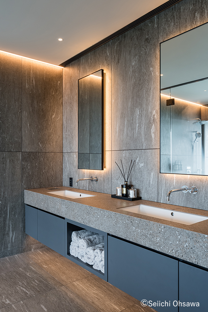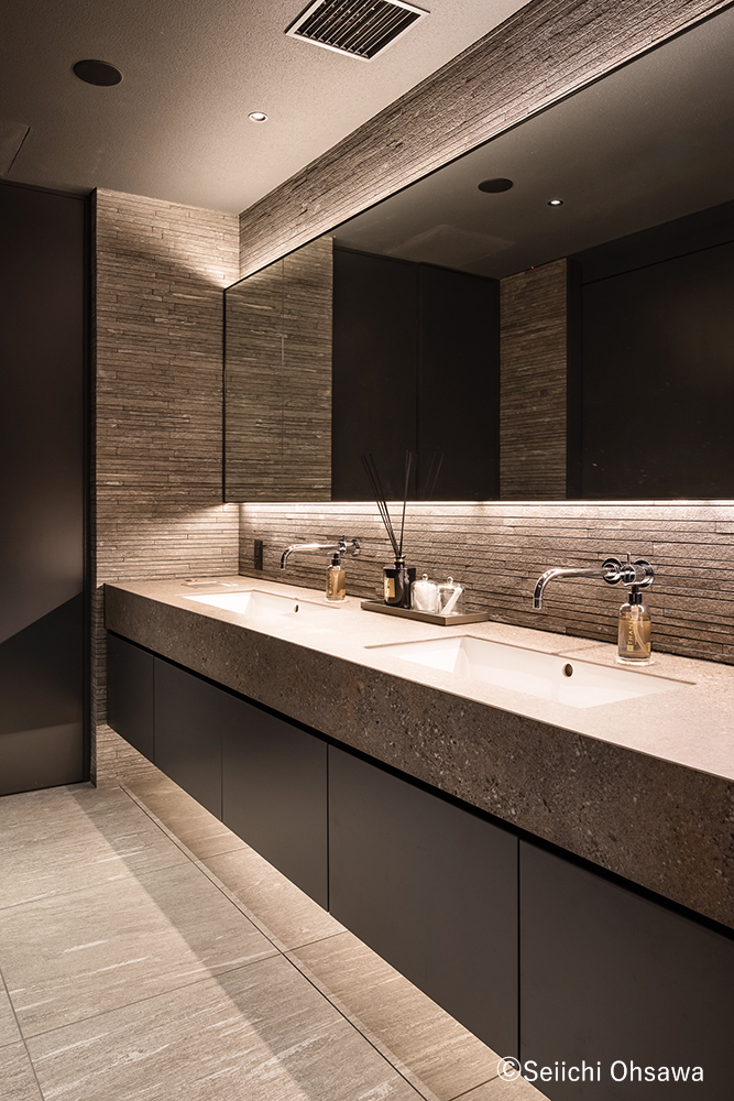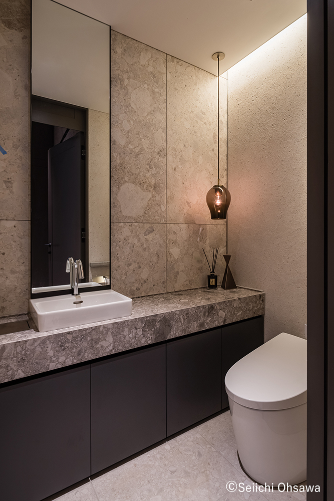 本館2Fのトイレ。リビングと同じゾーンに位置するここは、鉱物の荒々しさや強さを感じる一方で、水栓金具や照明の器具などをあえて“魅せる"ように配置。力強さだけではなく、手を入れることで洗練された空間に仕上げている。