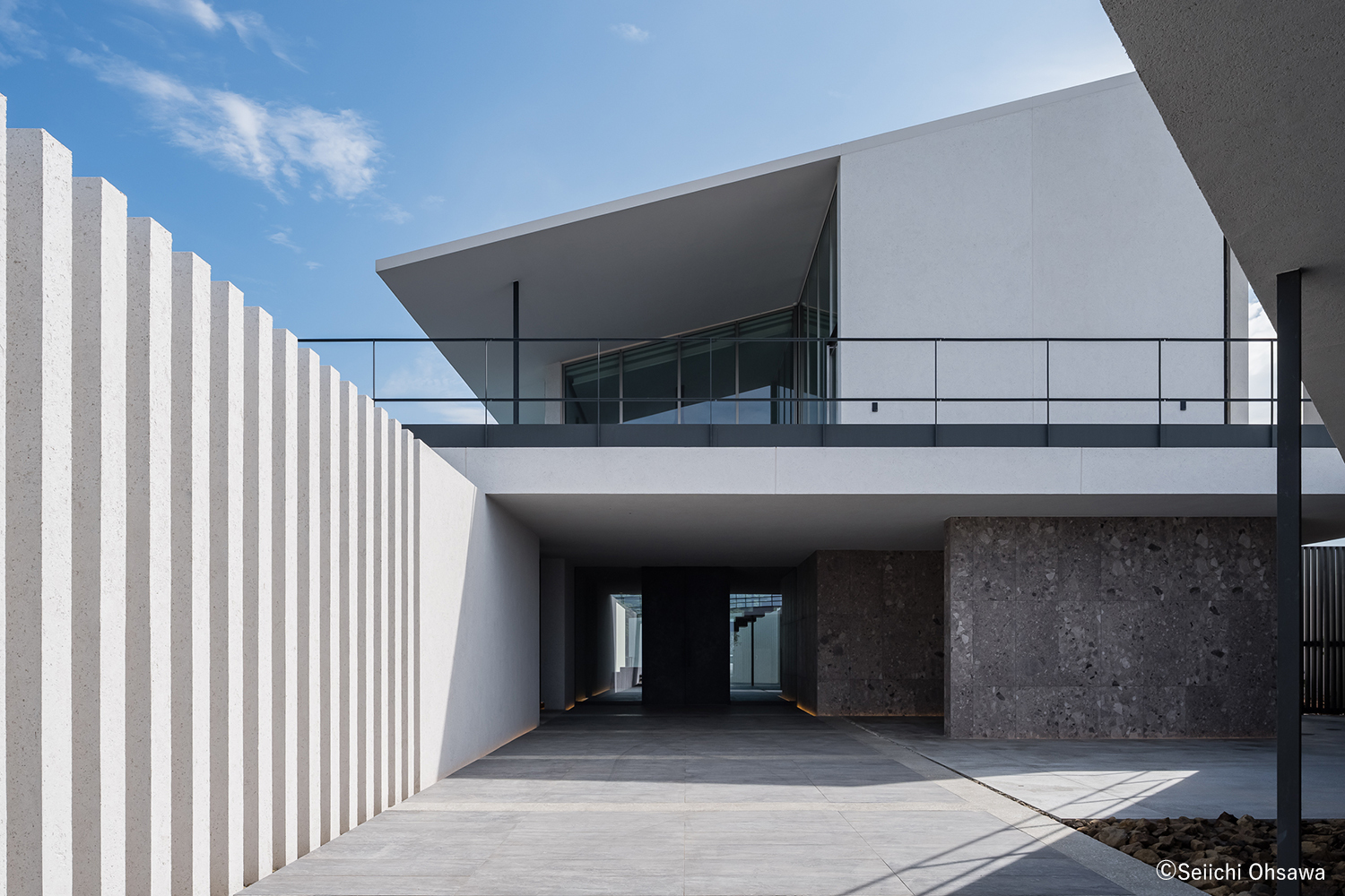 このヴィラは、真ん中のくびれた敷地に対して“本館”“アネックス”の2棟を配し、それらをグランドレベルと2Fレベルでそれぞれ“コリドー”でコネクトすることで“∞”の形を想起させる構成となっている。