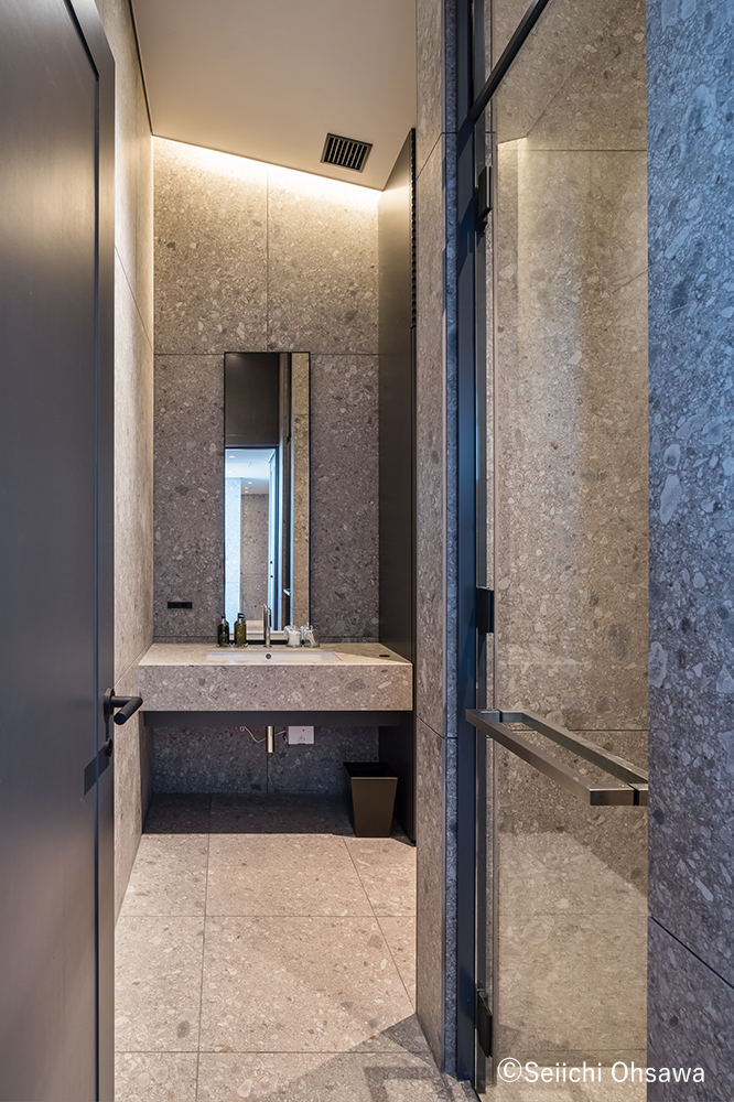 本館2Fの洗面室。スパへ向かう導入の場として天井を低く抑え、外への開口を持たないことで、異なる世界への導入空間として作用する。1F同様に器具の存在を感じさせない設えが、石の量塊感を強くしている。