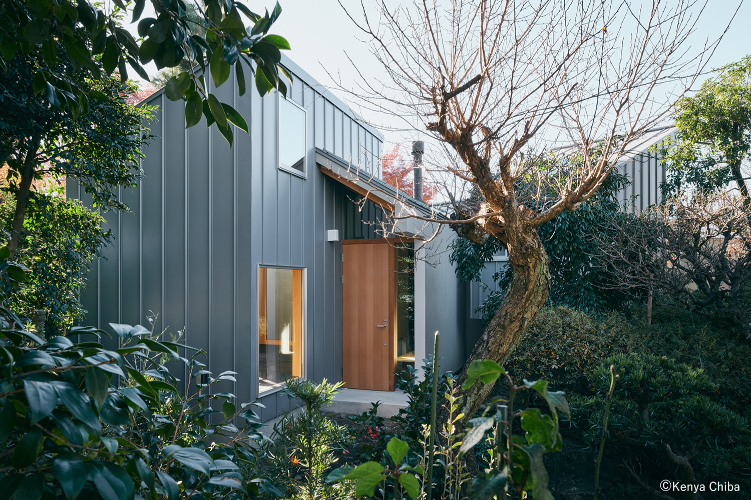 樹木や庭石、灯籠が複雑に入り組む住宅地の庭の中に、夫婦二人のための住まいをつくることとなった。まず私たちは、長年大切に守り育ててきた両親の思いを受け止め、一本一本の樹木に番号を付け、土地の起伏を拾い上げるように調査を行った。すると、日々の歩みで踏み固められた小径と、使われなくなったキウイ棚が残る小さな空地が、重なり合う緑の層の中から静かに浮かび上がってきた。
