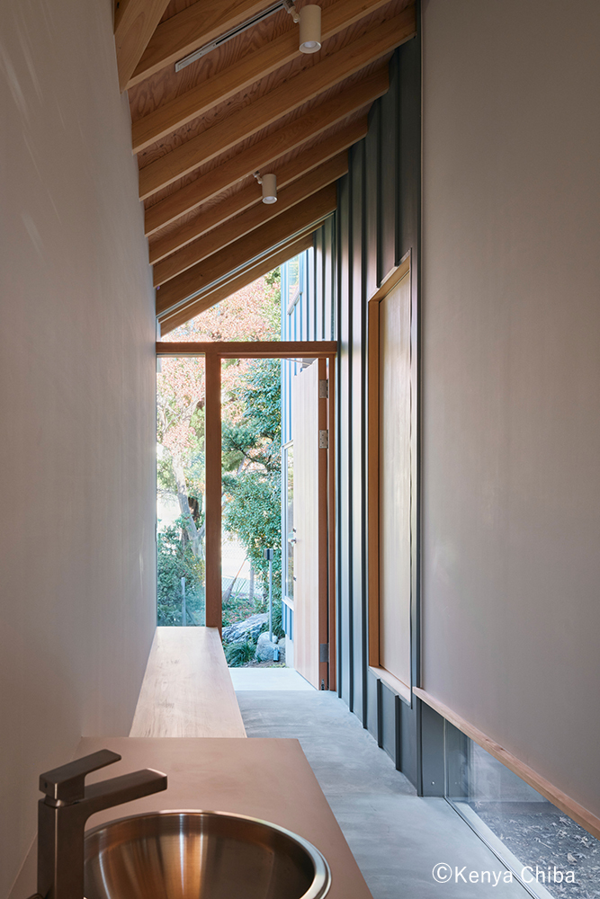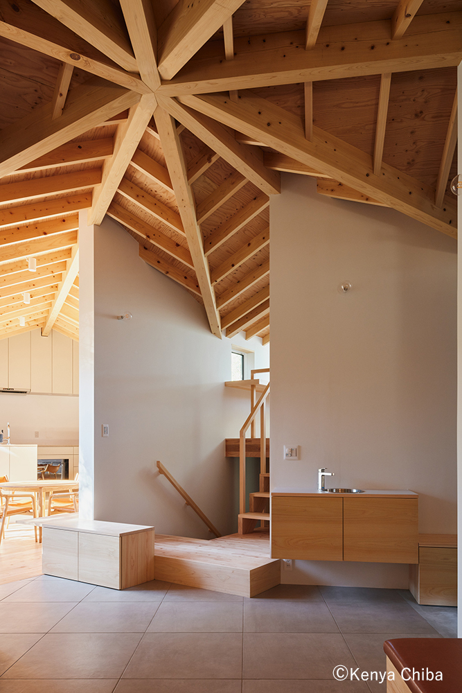 五つの屋根が交差する中央のホールは、特定の機能に縛られない中立的な「余白」として設計した。小さな段差やベンチ収納を“置く”ように点在させ、家具の延長のように手洗器を設けることで、日常の動線に滞在のきっかけをつくっている。