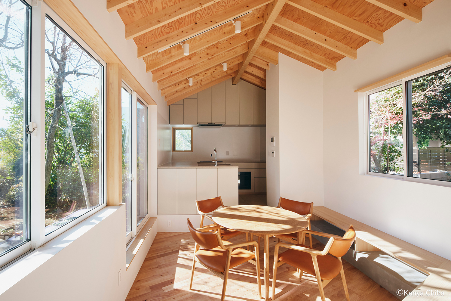 フロアレベルが異なるキッチンとロフトはそれぞれ南側に開かれた配置とし、ワンルームとして天井を連続させることで、空間に広がりを与えている。