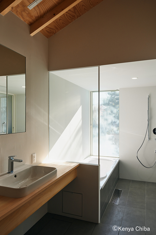 透明なガラスドアで仕切られた浴室と洗面室。浴槽の幅に揃えた開口からの光が、白い壁を舐めるように差し込み、水まわりに静かな透明感を与えている。ホールから連続する佇まいをもつ木製カウンターと、浴室へ連続する白い塗装壁や床のタイルが、三つの室を緩やかにつなぐ。