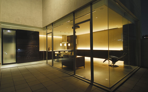 昼間は窓から差し込む自然光が壁面に映し出す陰影によって、夜間は間接照明から生み出される黄橙色の光によって、無機質で冷たいコンクリートはやさしく穏やかな表情に変化する。