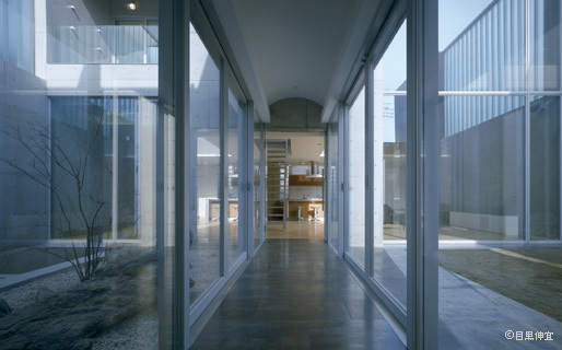 道路側に面した玄関ホールのある棟と、中庭を挟んだ敷地奥側のリビング・ダイニングのあるメイン棟の間をガラス張りの通路で接続。その通路の玄関から向かって左側の中庭は「枯山水」、右側はコンクリートと芝生の組み合せにアクセントとして姫シャラを配したシンプルな構成でまとめ、日常的な導線の中に「四季折々で変化する対照的な2つの風景」といった要素を盛り込んだ。また、中庭は高い壁面で囲われており、建物の開口のほとんどはその中庭に面している。それにより、玄関に入った瞬間から周囲の雑踏からは完全に切り離され、そこに住まう家族だけの落ち着きのある生活空間をつくり出している。