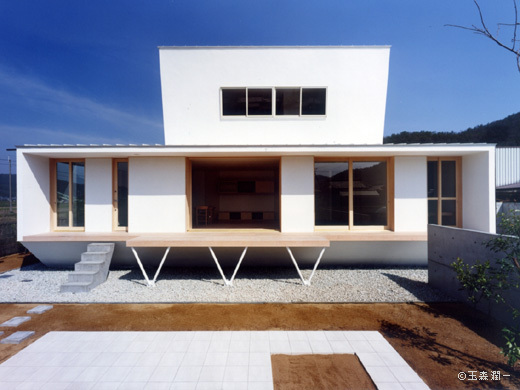 2階の南面の壁は10度の傾きを持っている。庇の軒下となるべきスペースを斜めに室内に取り込んだ。視線の上方への拡散は空間に変化をもたらすと共に、外観を特徴付ける物となっている。