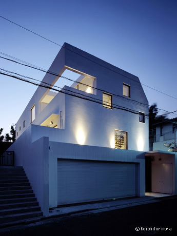 建物が肩を寄せ合って建つ仕事場併設の都市住宅。敷地は南北に細長く、前面道路と半層分ほどの高低差があったため、平面的、断面的にボリュームをずらすことで屋内への自然採光を確保している。北面のファサードには透かし積みで編み込むようにブロックを積み上げ、プライバシーを守りながら淡い光を取り込む。敷地の状況から半層ずつずれながら積層されるリビング、ダイニング、ルーフテラスを、全方向から使えるキッチンが要となってつなぎ、それぞれが個性を放つ。一方で、地階(前面道路階)のガレージから続く仕事場は、街と視覚的につながりつつ、上階の居住エリアに緩やかにつながる下層階の要となっている。