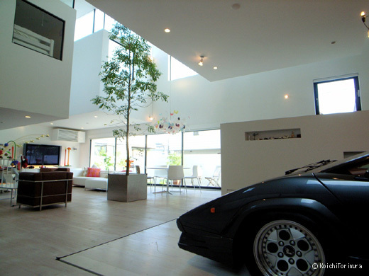 この家のLDKに入ると、まず車と高木の存在に驚かされるだろう。リビングに愛車と高木を置くことは、この物件におけるクライアントの強い要望であった。家の中にふつうあるはずのない車と高木――住宅という小規模の建物の内部に、それらの要素が介入する中で、どれだけ充分な平面を確保できるかが、この物件を設計するうえでの大きなポイントとなった。そのために、その他の部屋をLDK上部にそれぞれ浮遊させることで、LDKフロアを広く確保することができた。各浮遊する部屋の平面的な位置や高さの設定には、特に細かく配慮した。こうして部屋が浮遊する中で、LDKに愛車・高木を存在させながら、余裕を持ったくつろげる空間が確保された家ができ上がった。