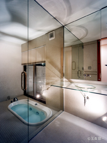 2階はラウンジと客室を改修した。3室ある客室は露地を持つ和室へと生まれ変わった。3、4階の客室は既存を残しつつ水まわりを改修。それぞれ違う色の施釉タイルを使い静寂に包み込まれるような浴室となった。