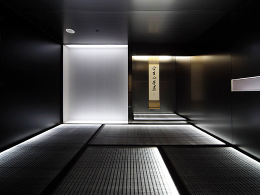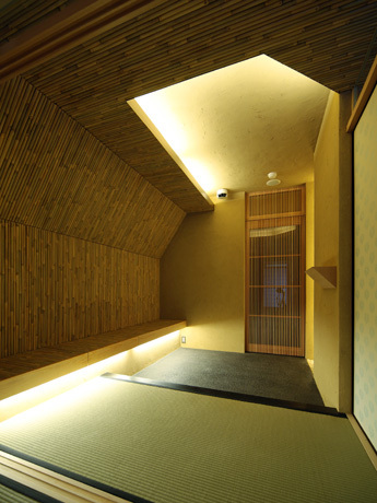広間、小間と呼ばれる2つの間は、それぞれ異なったアプローチで光と素材を取り入れた。広間は自然光を重視し、茶室で伝統的に使用される「杉」「竹」といった自然素材で構成、小間は人工光を積極的に取り入れ「ガラス」「ステンレス」という現代を代表する人工素材で構成する空間とした。