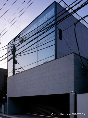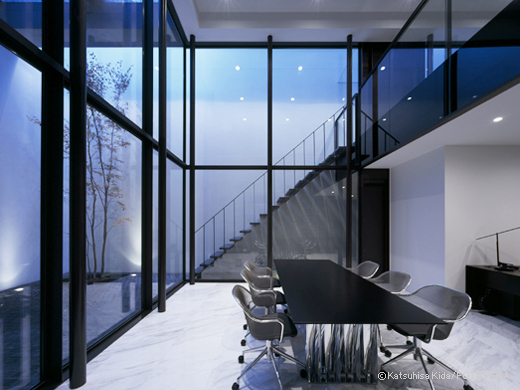 都心の閑静な住宅街に建つ、40代夫婦と小さな子どものための住宅である。 「生活感を出さず、きれいに暮らしたい」という要望が施主よりあげられ、全ての要素をひとつひとつ相談しながら設計を行った。 まず、コンクリートと面一の大きなガラスからなる正面の無機質な外観が目をひく。 その内側には一定のスペースをとり、その奥に改めて別の窓や壁を設けた。それにより、外部に伝わる生活感を抑えることができる他、部屋の内部の様子が外からわかりにくくなり、防犯やプライバシーの面で効果を発揮している。 他にも同様に内側に別の壁やガラスが設けられている面があり、外からは守られながらも、同時に内まで光や風が入る開放的なスペースを持つ住宅が実現した。 施主が気にする「生活感」が最も出やすいのはリビングである。 ここでは、家族が毎日使用する「ファミリーリビングダイニング」とは別に、来客時に使用する「ゲスト用リビングダイニング」を設け、来客に対して露呈する日常感を払拭した。 全ての生活感を排除するのではなく、見せ方の工夫や使い分けをすることで、美しく暮らしながら生活できる空間を作り出している。 この住宅のその他の特徴は、「メイン浴室」「子供用バスルーム」「トレーニングルーム横バスルーム」の3つのバスルームが設けられた水まわりである。 施主のライフスタイルはシャワーの使用が主ということであったが、リラックスする時間も必要であると考え、「メイン浴室」にはシャワーブースの他にバスタブも配置した。 その横の洗面キャビネットは、床から浮いたようなフローティングスタイルをとっており、約4mの大理石の天板を使用しながらも、空間に軽やかさを出している。