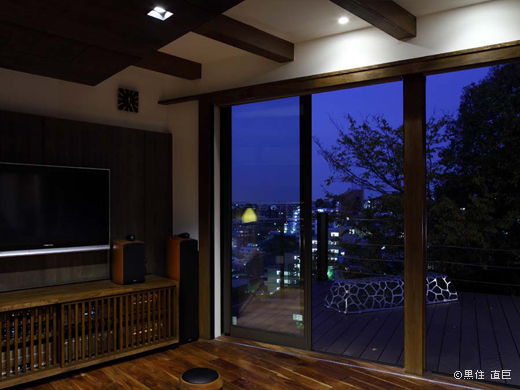 そして、今、斜面に張り出した天空のデッキに立てば遠くを見晴るかす。 朝、日中、夕刻、そして夜景へと刻々と変化する空、対岸の風景――全てはこの風景を手に入れるための住まい。