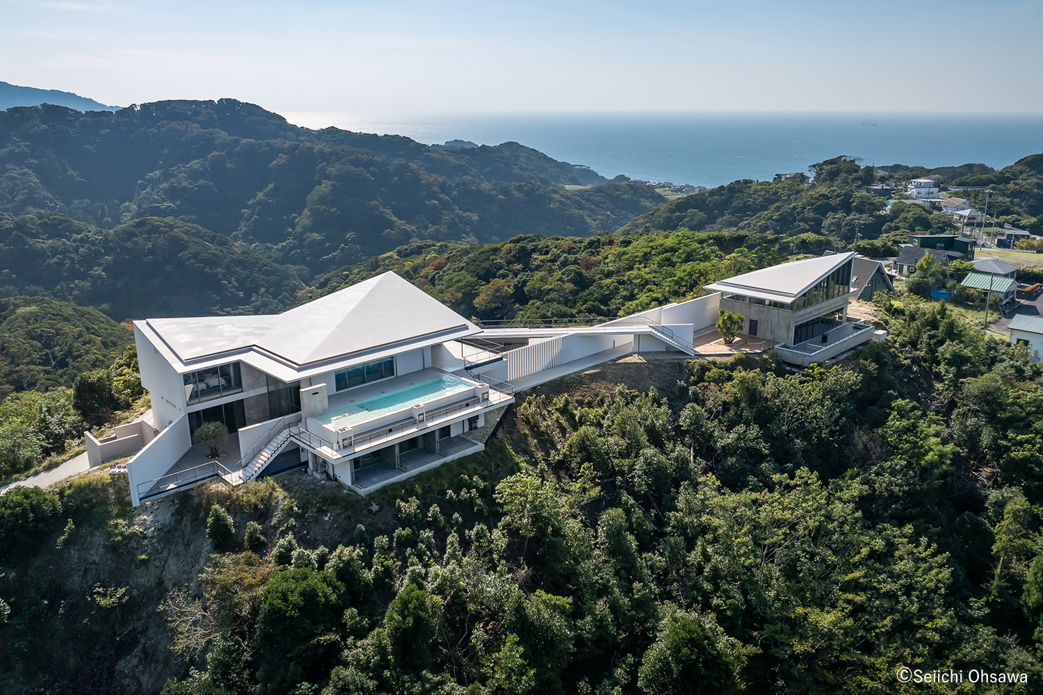 本計画は山の頂上に位置し、周囲を海と山と空に360゚囲われた場所に建つ、別荘兼一棟貸しの宿泊施設である。