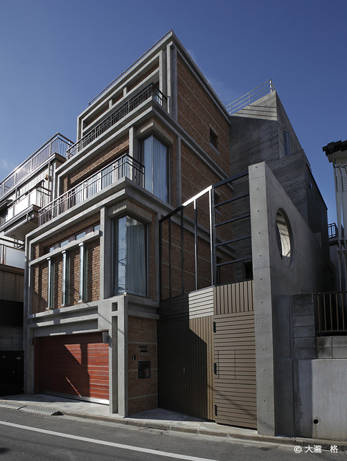 建物が肩を寄せ合って建つ仕事場併設の都市住宅。敷地は南北に細長く、前面道路と半層分ほどの高低差があったため、平面的、断面的にボリュームをずらすことで屋内への自然採光を確保している。北面のファサードには透かし積みで編み込むようにブロックを積み上げ、プライバシーを守りながら淡い光を取り込む。敷地の状況から半層ずつずれながら積層されるリビング、ダイニング、ルーフテラスを、全方向から使えるキッチンが要となってつなぎ、それぞれが個性を放つ。一方で、地階(前面道路階)のガレージから続く仕事場は、街と視覚的につながりつつ、上階の居住エリアに緩やかにつながる下層階の要となっている。