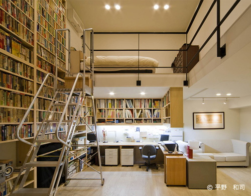 基本的な構造を平屋の大きなワンルームとし、最大限にロフトを設け、趣味と収納のスペースとした。
