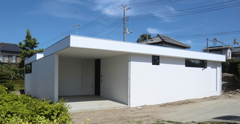 建築主は古くからのコミニュィティが成立する住宅地でもプライバシーが確保されるフラットな空間(平屋)と、多く所有するミッドセンチュリーの家具が似合う空間を希望。