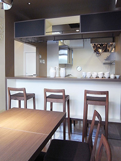 店内は、立体的な空間構成により空間の容量を大きく感じさせることを意図した。機能上必要な間仕切りを最低限として配置し、さらに間仕切り自体も「壁」として視覚的に認識しにくいような意匠を心がけた。ひとつの「膜」のように床・壁・天井と立体的に連続する茶色の面は、厨房と客席間を緩やかに間仕切るとともに、やさしく包まれた空間は落ち着きのある場所を造り出している。トイレは天井面まで達しない白のタイル貼りの「箱」とすることで家具のような様相を呈し、奥行きを阻害しない広がりのある空間に寄与している。