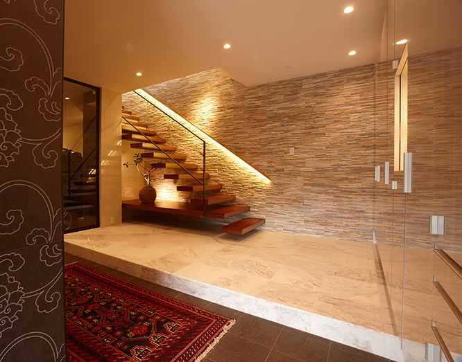 例えば、庭の大きな円弧のアプローチを歩いて行った先にある、高さ3mを超える玄関扉、暗いホールの先にある階段の上から、陽の光が燦燦と降り注ぐトップライトなど。