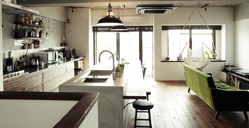 築40年に迫るマンションの一室を全面リノベーションして完成した、二人暮らしの夫婦の自宅兼オフィス。開放感のあるリビングダイニングを中心に、豊富な採光を活かしつつ家具などのインテリアアイテムと調和する空間を目指した。シンプルでありながら、フローリングやタイル、パーティションなどの素材感がアクセントを加えている。水まわりや空調設備など実用性を求められる箇所においては、日常での使い心地とデザイン性の両立を特に重視してレイアウトや器具を検討した。