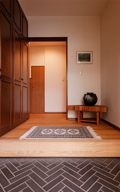 改修前は、当時主流だった北側に位置する狭くて暗い閉鎖的な台所・食堂と、南側に広く明るい居間がある古典的な間取り。そのふたつの空間をうまく繋げ、全体的に広く明るく楽しい空間にすることが若い家族には必要と考えた。ソファ付のリビングとして考えている南側の空間は、本格的な和の空間。既存建築をリスペクトして、うまく整え繋ぐことが私の仕事だ。連続する天井材を注意深く選定して、和の建築に洋の生活が混在できる新しい空間をつくり上げた。外構工事はこれから、造園家のご主人にバトンを渡し、コツコツとつくり込んでいく。これからの建築は、古いものを活かし新しいものへと繋げることが、強く求められる時代になるような気がしている。