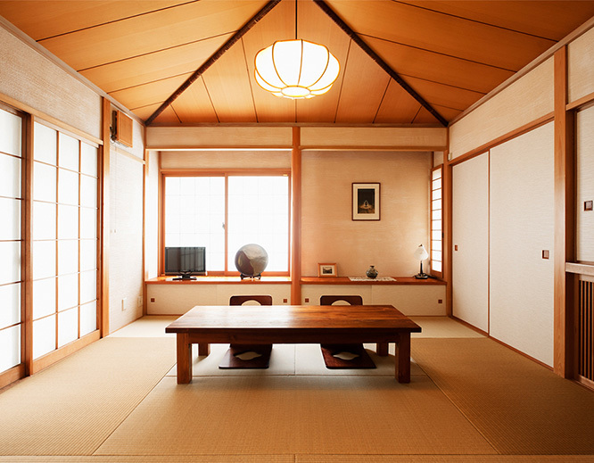 元々素晴らしい建物だったが、ホテルとして機能するために必要となるのが設備の設置。それに伴い必要となる天井の改装には技術的、デザイン的に検討を重ね、数寄屋建築の素晴らしい意匠をできるだけ残しながら設備の設置を実現した。天井以外についても終始既存建物へ敬意を払いながら設計し、細部の色合いや素材は現場でていねいに確認しながら決定していった。