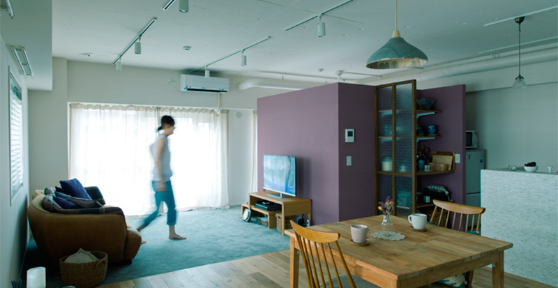 趣味で集めた本やCD、服などの収納場所が必要となり、より広いマンションに住み替えたご夫婦。大切なものを身近に感じながら暮らせるようにデザインリフォームをした。廊下をなくし、水まわりを一箇所にまとめることで大空間のリビング・ダイニングを実現している。パブリックゾーンの床は挽板フローリング、壁はグレーの珪藻土で仕上げ、上品でくつろいだ雰囲気に。玄関とLDKの間には、読書を楽しめる小上がりを設置。ディスプレイスペースを充実させ、好きなものに囲まれ、夫婦が互いの気配を感じながら過ごせる住まいとしている。