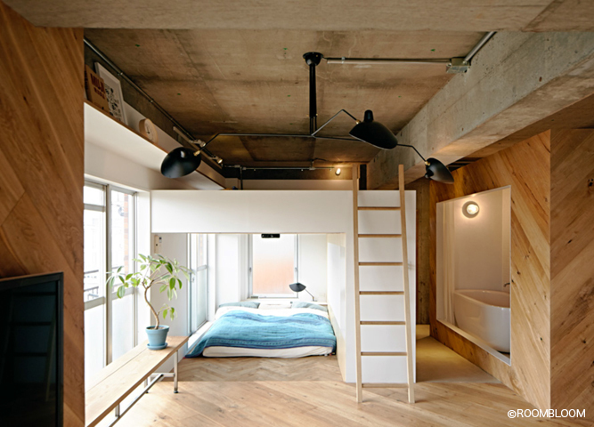 個室で分断されていた屋上テラスに面した南側は、贅沢に使用されたビル用サッシの潜在力を活かすべく、開放的なワンルームのLDKにつくりかえた。水まわりの位置を踏襲した以外は、スケルトン・インフィルで全面的なリノベーションを実施した。