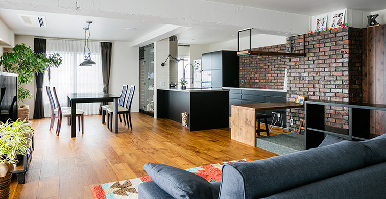 友人を招いてホームパーティーを楽しめる空間にしたいというリクエストから、落ち着いた雰囲気でありながら遊び心のあるブルックリンスタイルをご提案。キッチンの壁一面にはアンティーク煉瓦を施し、リビングには古材のデスク、扉にはスギの羽目板を採用している。色むらや経年変化を感じさせる表情豊かな素材を使用し、ラフさと味わい深さ、重厚感のある空間に仕上げた。
